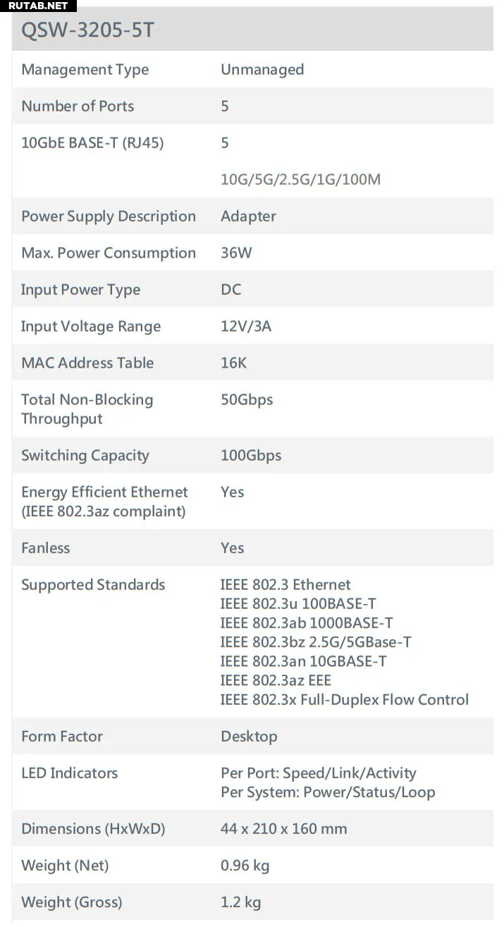 QNAP Systems, Inc., ведущий новатор в области вычислительных, сетевых и хранилищных решений, выпустила QSW-3205-5T, начального уровня, полный 10GbE неуправляемый коммутатор. Благодаря компактному настольному форм-фактору и сверхтихому охлаждению, QSW-3205-5T обеспечивает пять портов 10GbE RJ45 и функции автоматической оптимизации сети, такие как Jumbo Frame и обнаружение петель. Будь то для малого бизнеса, групп по производству видео или дома, QSW-3205-5T позволяет пользователям быстро достигать плавной высокоскоростной передачи данных, быстрого обмена файлами и многопользовательской совместной работы и редактирования видеофайлов 4K/8K.