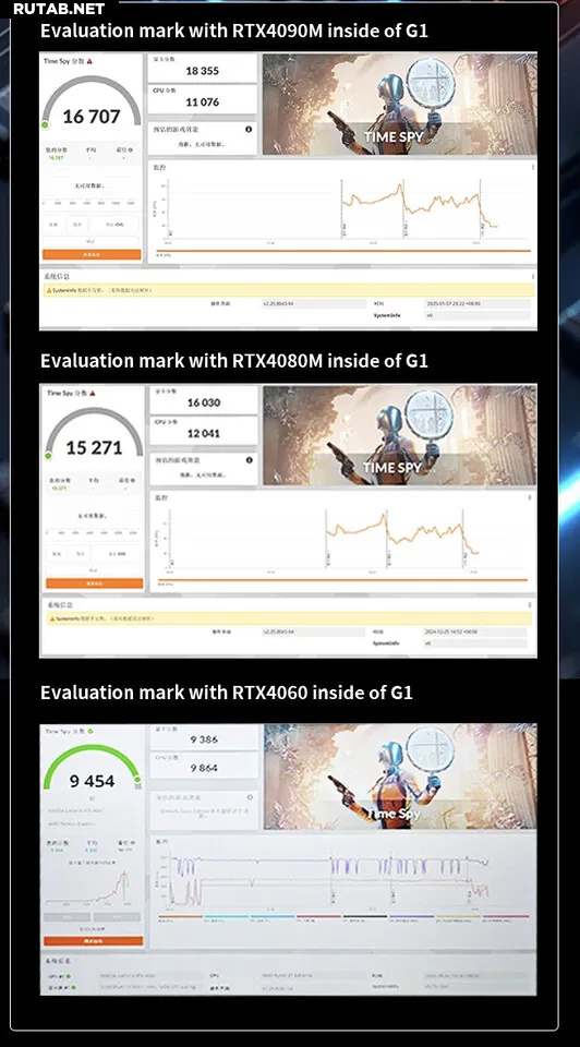 Для тех, кому нужно освежить память, ноутбук RTX 4060 оснащен 3072 ядрами CUDA в паре с 8 ГБ видеопамяти GDDR6, что обеспечивает производительность, которая примерно соответствует производительности графического процессора Radeon RX 7600M, встречающегося во многих других eGPU. Графические процессоры ноутбуков RTX 4080 и RTX 4090 оснащены 7424 и 9728 ядрами CUDA в паре с 12 и 16 ГБ видеопамяти GDDR6 соответственно. Morefine раскрыла результаты 3D Mark для каждой из систем, что, безусловно, хорошо для потенциальных покупателей. Корпус размером 14 x 10 x 5,4 см впечатляюще компактен, и, как упоминалось ранее, предлагаемые порты также впечатляют. Предусмотрен порт OCuLink, а также Thunderbolt 3 (85W PD), который можно заменить на двойной модуль USB-C для людей с системами, которые не могут воспользоваться преимуществами OCuLink. Другие порты включают тройной USB-A 3.2, двойной HDMI 2.1 и порты DisplayPort 1.4.