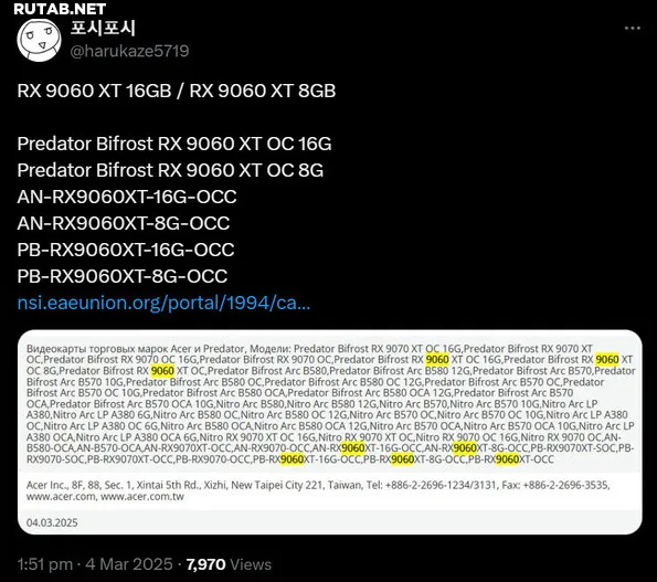 Acer регистрирует несколько моделей Radeon RX 9060 XT с конфигурациями памяти 16 ГБ и 8 ГБ