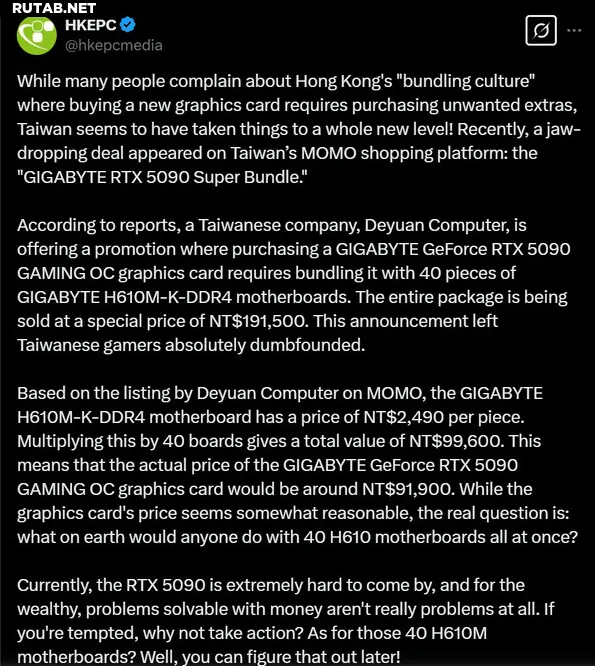 Тайваньские издания обратили внимание на необъяснимо разработанный «GIGABYTE RTX 5090 Super Bundle». Согласно региональным сообщениям, местная компания Deyuan Computer выставила этот необычный многокомпонентный пакет на тайваньской платформе электронной коммерции MOMO. Видеокарты GeForce RTX 5090 в настоящее время являются ходовым товаром — к сожалению, ограниченные поставки и спекулятивная деятельность создали нестабильную среду для постоянных игроков. Розничные магазины внедрили различные «изящные» методы продаж в попытке создать более справедливую среду покупок — до и после запуска. Гонконгская HKEPC Media признала, что местные жители очень привыкли к «культуре комплектации», которая требует покупки лишних дополнительных предметов.