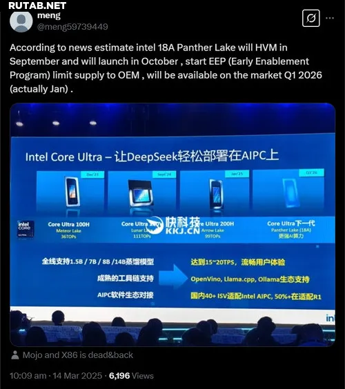 Наблюдатели из Team Blue считают, что крупносерийное производство (HVM) чипов Panther Lake начнется в сентябре. К октябрю ожидается запуск программы Early Enablement Program (EEP) — образцы будут отправлены OEM-производителям для полного одобрения. Эксперты отрасли полагают, что Intel будет следовать знакомой схеме «объявления процессора во второй половине предыдущего года, но наращивания массового производства в следующем году». Предыдущие поколения мобильных процессоров — Meteor Lake и Lunar Lake — получили аналогичное отношение в недавнем прошлом. На прошлой неделе образец Panther Lake-H (PTL-H) был представлен широкой публике на выставке Embedded World 2025 — немецкий офис также занимается раскруткой возможностей AI-крашинга запланированных продуктов.