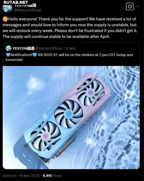 Йестон прогнозирует стабилизацию поставок серии Radeon RX 9070 после апреля