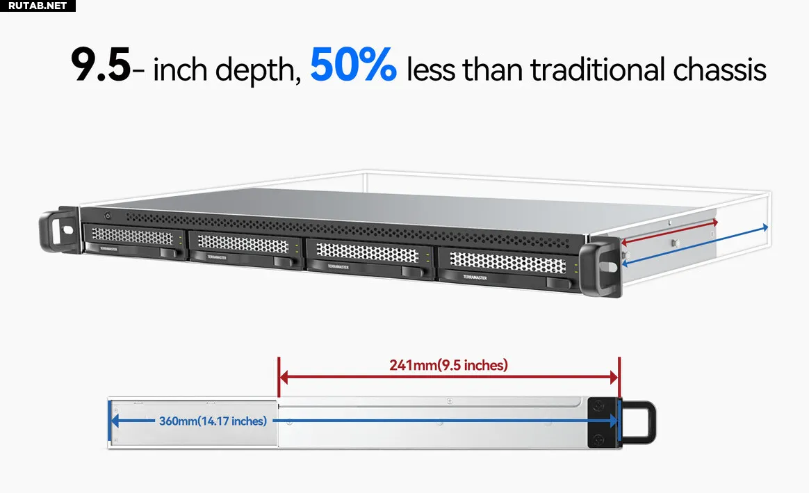 D4-320U переопределяет удобство благодаря своему миниатюрному форм-фактору 1U для монтажа в стойку. Имея глубину всего 241 мм (9,49 дюйма), на 50% короче традиционного шасси и веся 3,2 кг, этот элегантный корпус легко помещается в стандартные серверные стойки без необходимости использования направляющих, что упрощает установку. Его компактная конструкция максимизирует использование пространства в центрах обработки данных, складских помещениях, лестничных клетках или офисах, что делает его идеальным выбором для малого бизнеса и пользователей SOHO, ищущих централизованные решения для хранения данных.