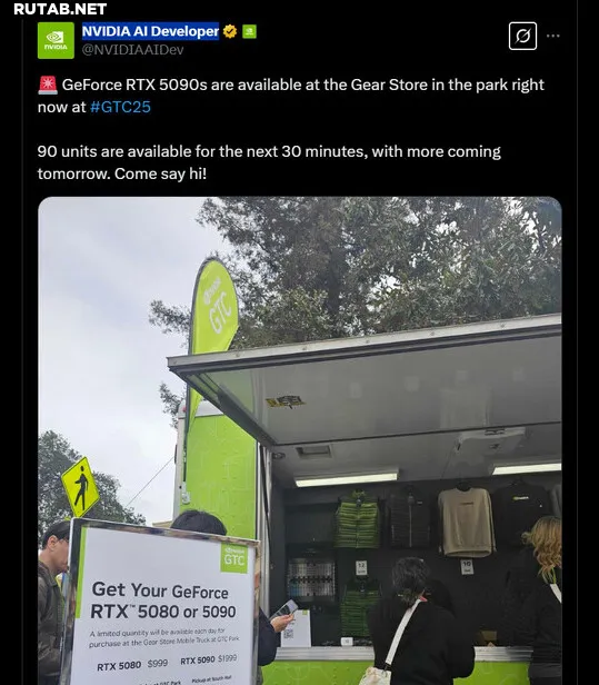 Вчера вечером аккаунт NVIDIA AI Developer в социальных сетях разослал красное предупреждение об ограниченной по времени распродаже флагманского игрового оборудования Blackwell: «GeForce RTX 5090 доступны в Gear Store в парке прямо сейчас на GTC 2025. 90 единиц доступны в течение следующих 30 минут, и завтра появятся новые. Приходите поздороваться!» Новостные агентства, посвященные компьютерному оборудованию, подхватили последний биржевой бюллетень Team Green, а Tom's Hardware раскрыл некоторые дополнительные подробности. При обычных обстоятельствах мобильный грузовик Gear Store от NVIDIA продавал бы довольно стандартные товары — например, футболки, свитера, шапки и т. д. Согласно последним сообщениям, мобильный магазин компании принимает заказы на модели плат расширения (AIB) GeForce RTX 5090 и RTX 5080. Информационная табличка рекламирует ориентировочные цены старой школы/дня запуска в размере 1999 и 999 долларов (соответственно).