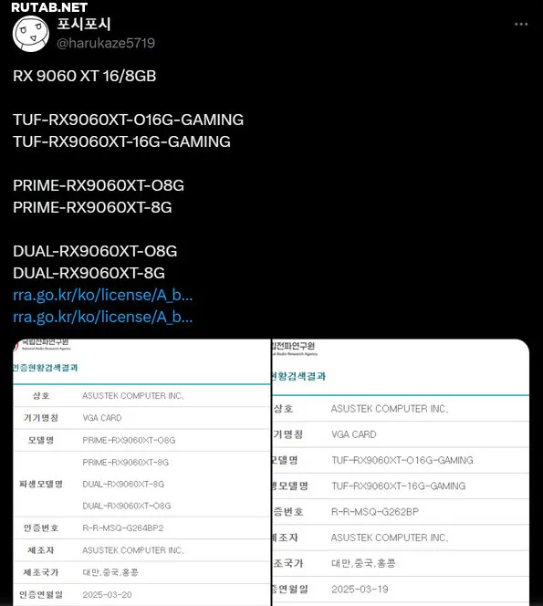 ASUS регистрирует несколько моделей Radeon RX 9060 XT 16 и 8 ГБ в Южной Корее