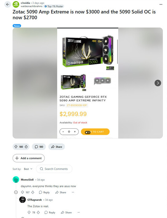 ZOTAC в США вновь поднял цены на GeForce RTX 5090