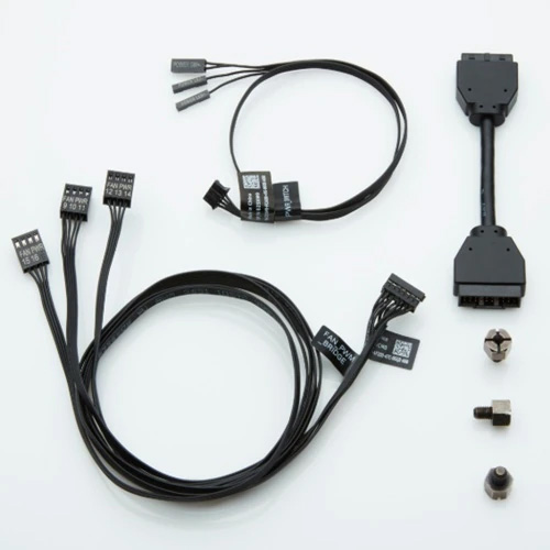 В комплект входит 4-контактный кабель электропроводки выключателя питания, кабель электропроводки моста питания вентилятора, удлинитель USB-донгла и пакет с тремя гайками. Кабель электропроводки выключателя питания отвечает за подключение к кнопке питания Area-51. Кабель электропроводки моста питания вентилятора обеспечивает совместимость с задним контроллером вентилятора Area 51. Удлинитель USB-донгла преобразует прямоугольный внутренний разъем USB 3.0 на передней панели из 90 градусов в традиционный разъем для улучшения совместимости.