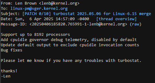 Turbostat имел жестко запрограммированный предел (CPU_SUBSET_MAXCPUS), установленный на 1024, что определяет максимальное количество процессоров (ядер), которые он может обработать. Вчера, как раз перед закрытием окна слияния для Linux 6.15-rc1, предел процессора был увеличен до 8192 вместе с добавлением инструмента телеметрии отладки простоя процессора и несколькими исправлениями ошибок.