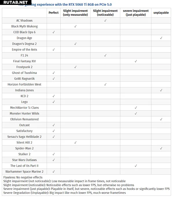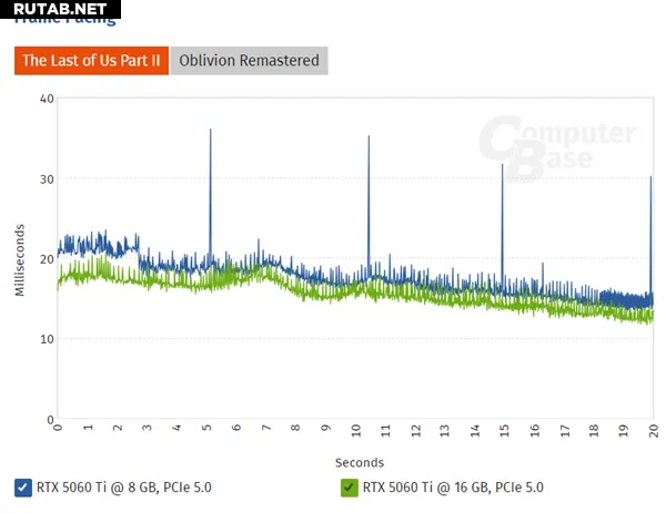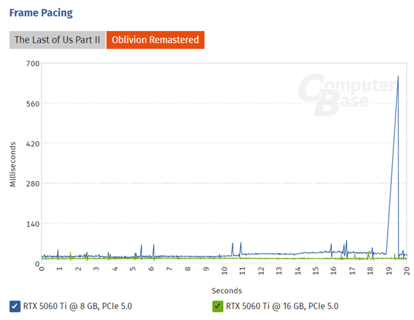 Тесты задержки кадров в «The Last of Us Part II» и «Oblivion Remastered» показали, что 8-гигабайтная версия имеет более высокую задержку с периодическими резкими скачками, что приводит к «зависанию» изображения.