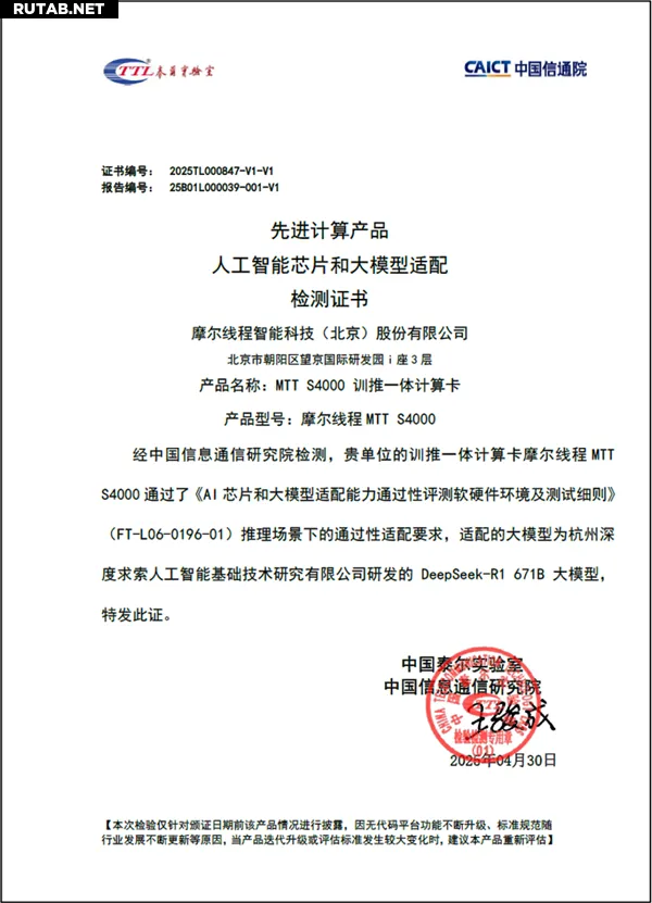 Согласно результатам тестирования, вычислительная карта MTT S4000 «нормально и стабильно работает» с моделью DeepSeek-R1 671B, удовлетворяя требованиям для сценариев логического вывода (инференса). Чип получил соответствующий сертификат.