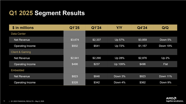 Компания AMD опубликовала финансовые результаты за первый квартал 2025 года, показав рекордные показатели. Чистая прибыль составила 7,09 млрд долларов (около 602 млрд рублей), что на 476% больше, чем годом ранее. Это больше, чем AMD заработала за весь 2019 год.