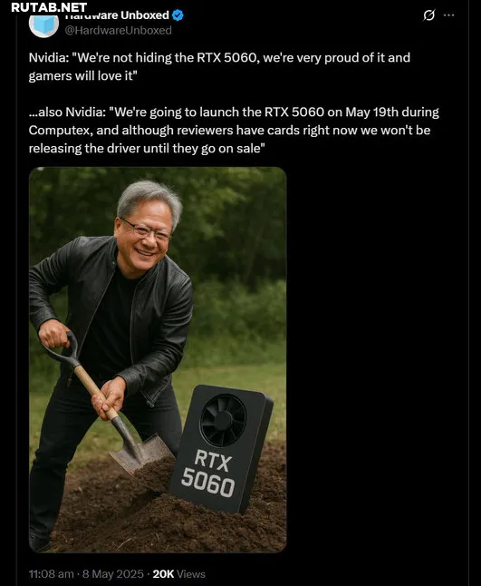 В своём твите Hardware Unboxed саркастично прокомментировали ситуацию: «Мы не скрываем RTX 5060, мы очень гордимся ею, и геймеры её полюбят. Однако, хотя обозреватели уже получили карты, драйверы будут доступны только после старта продаж 19 мая». Ранее в апреле издание уже критиковало NVIDIA за отсутствие тестовых образцов RTX 5060 Ti с 8 ГБ видеопамяти — на тесты отправлялись только 16-гигабайтные версии.