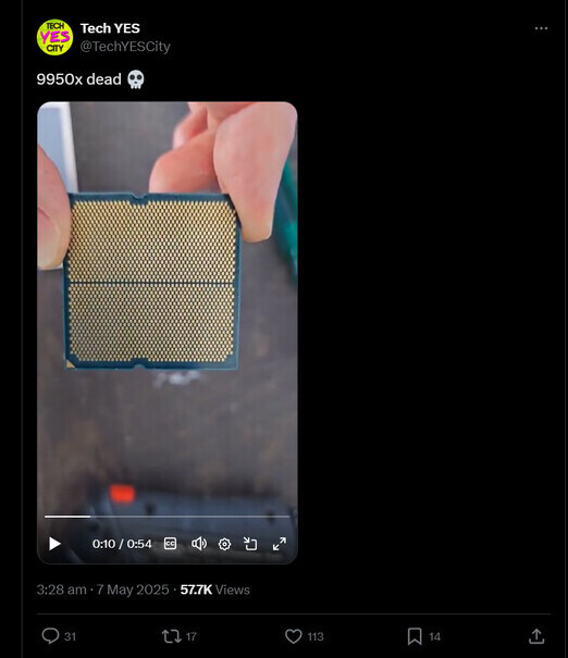 Технический ютубер Bryan Bilowol (Tech YES City) сообщил о гибели своего процессора, предположительно из-за материнской платы ASRock X870 Steel Legend. Хотя стандартные процессоры «Granite Ridge» без 3D V-Cache привлекают меньше внимания, эксперты считают, что они также уязвимы. Bilowol не стал свидетелем момента отказа — его друг использовал ПК, когда система внезапно перестала выводить изображение, а процессор оказался неработоспособным. На видео видно, что на мертвом CPU появились тревожные серые отметины.