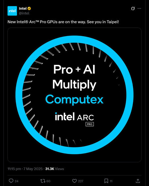 Компания Intel недавно намекнула в соцсетях* о выходе нового семейства видеокарт Arc Pro на выставке Computex 2025, которая пройдет с 20 по 23 мая в Тайбэе. Среди ожидаемых новинок — профессиональная видеокарта Arc Pro B60, вероятно, основанная на архитектуре Xe2 «Battlemage».