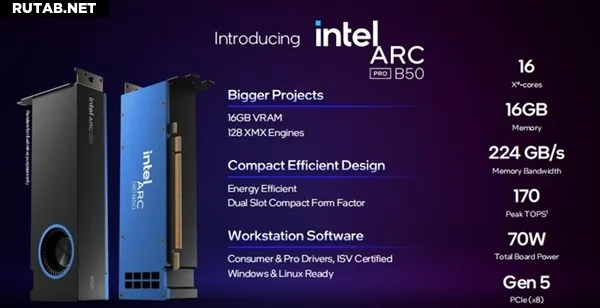 Обе модели основаны на архитектуре Xe2 и оснащены AI-ядрами XMX и продвинутыми блоками трассировки лучей. Младшая модель B50 предназначена для графических рабочих станций и обладает следующими характеристиками: