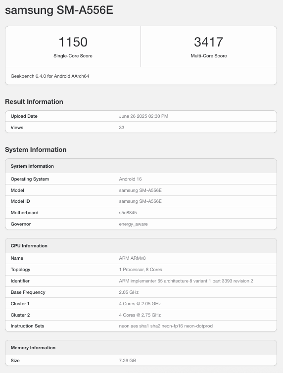 Хотя вряд ли это означает скорый публичный бета-релиз для A55, факт указывает на внутреннее тестирование. Показатели Geekbench — 1150 баллов в однопоточном и 3417 в многопоточном режиме — соответствуют результатам A55 на Exynos 1480 под управлением Android 15 и One UI 7.