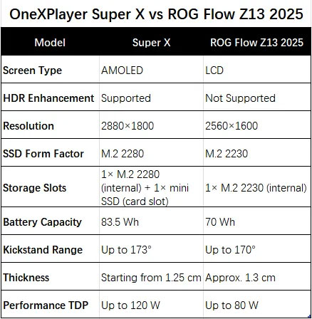Судя по предоставленным данным, OneXPlayer Super X превосходит решение от Asus по всем ключевым параметрам: качеству экрана, возможностям расширения, ёмкости аккумулятора и даже теплопакету (TDP), который на 50% выше.