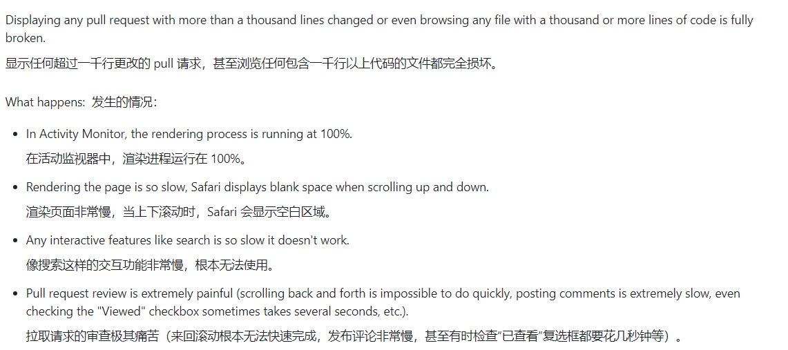 Один из пользователей сообщил на GitHub, что при попытке открыть pull request (PR) с более чем тысячей строк кода или изменений, браузеру требуется очень много времени для отрисовки кода.