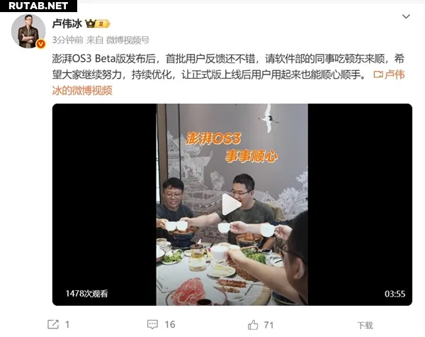 Президент Xiaomi Group Лу Вэйбин сообщил, что первые отзывы пользователей о бета-версии HyperOS 3 оказались положительными. В честь этого он угостил коллег из программного отдела ужином в ресторане Donglaishun, известной сети пекинских ресторанов горячего котла. Лу Вэйбин призвал команду продолжать усердно работать над оптимизацией, чтобы финальная версия ОС доставляла пользователям исключительно комфортные впечатления.