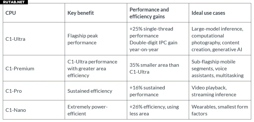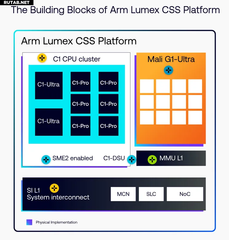 Платформа включает новейшие CPU Armv9.3 с поддержкой SME2, GPU Mali G1-Ultra с улучшенным трассировкой лучей (прирост производительности в 2 раза по сравнению с предыдущим поколением) и оптимизированные реализации для 3-нм техпроцессов.