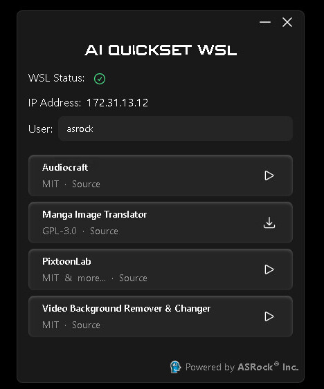 Инструмент ASRock AI QuickSet WSL напрямую решает эту проблему, автоматизируя весь рабочий процесс. Построенный на платформе AMD ROCm для высокопроизводительных вычислений, инструмент гарантирует, что среда WSL предварительно настроена для GPU-ускорения на новейших видеокартах ASRock AMD Radeon RX 9000 серии, обеспечивая максимальную производительность «из коробки». Помимо базовых фреймворков, таких как PyTorch (оптимизированный для ROCm), ASRock AI QuickSet WSL поставляется с несколькими готовыми к использованию приложениями. Среди них: Audiocraft для генерации музыки из текстовых запросов, Image/Manga Translator для перевода изображений и манги, PixtoonLab для преобразования портретов в мультяшные аватары и Video Background Remover & Changer для легкого удаления или замены фона на видео.