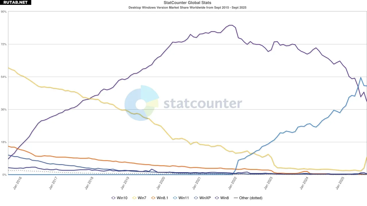Доля Windows 10 упала до минимума перед окончанием поддержки, а Windows 7 неожиданно выросла