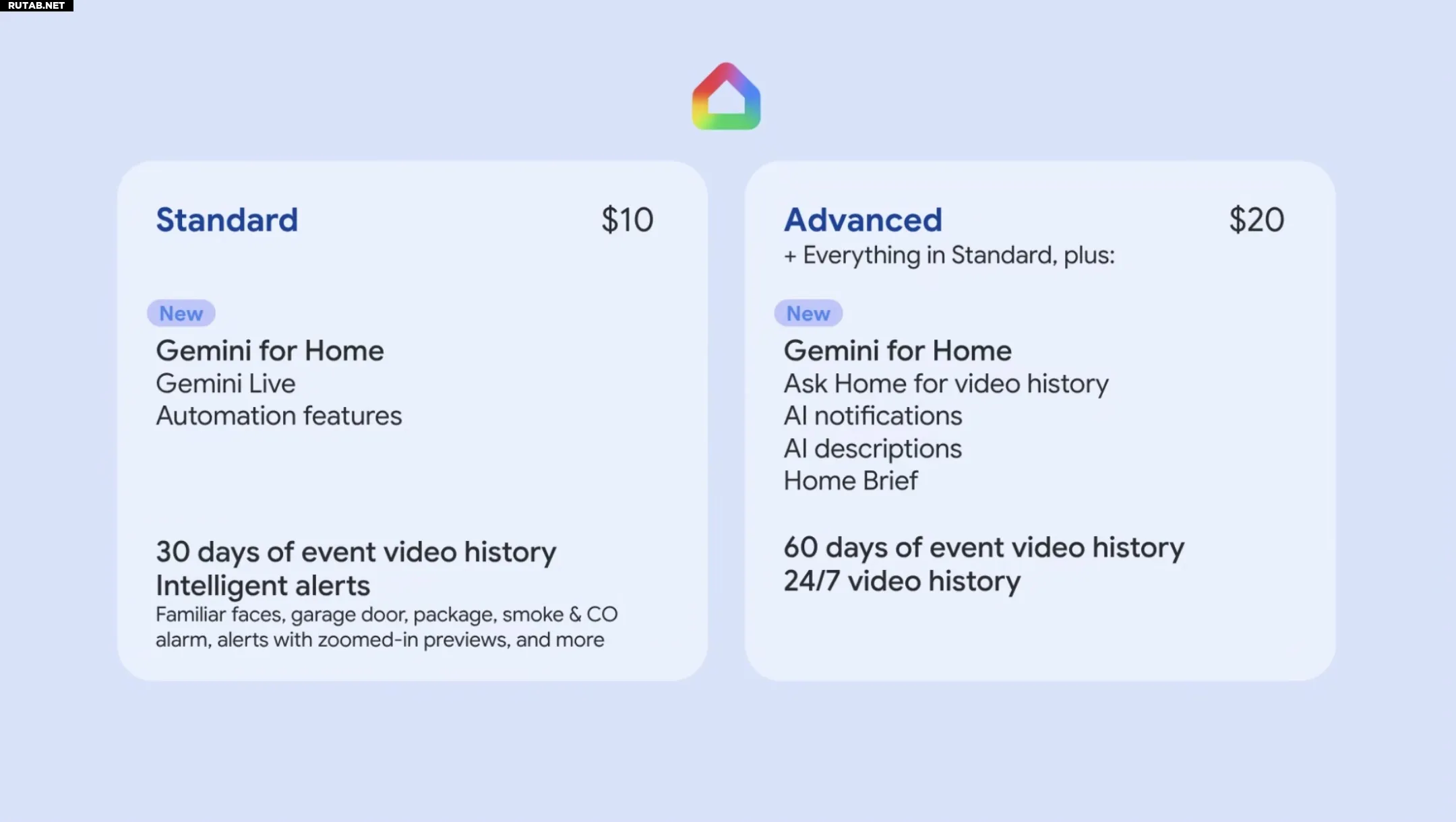 Параллельно Google переименовала подписку Nest Aware в Google Home Premium с сохранением тарифов: Standard за 10 долларов в месяц (~800 руб.) и Advanced за 20 долларов (~1600 руб.). Владельцы подписки Google One AI Pro получат Home Premium Standard бесплатно.