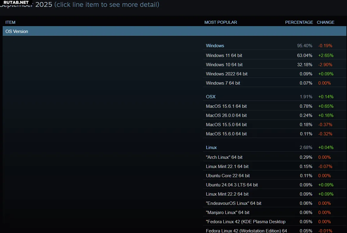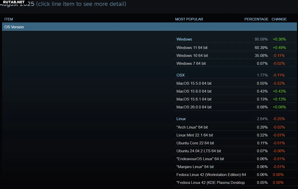 Доля macOS увеличилась на 0,14% — больше, чем у Linux. В целом, Linux занимает 2,68% пользователей Steam, macOS — 1,91%, а Windows доминирует с 95,40%.