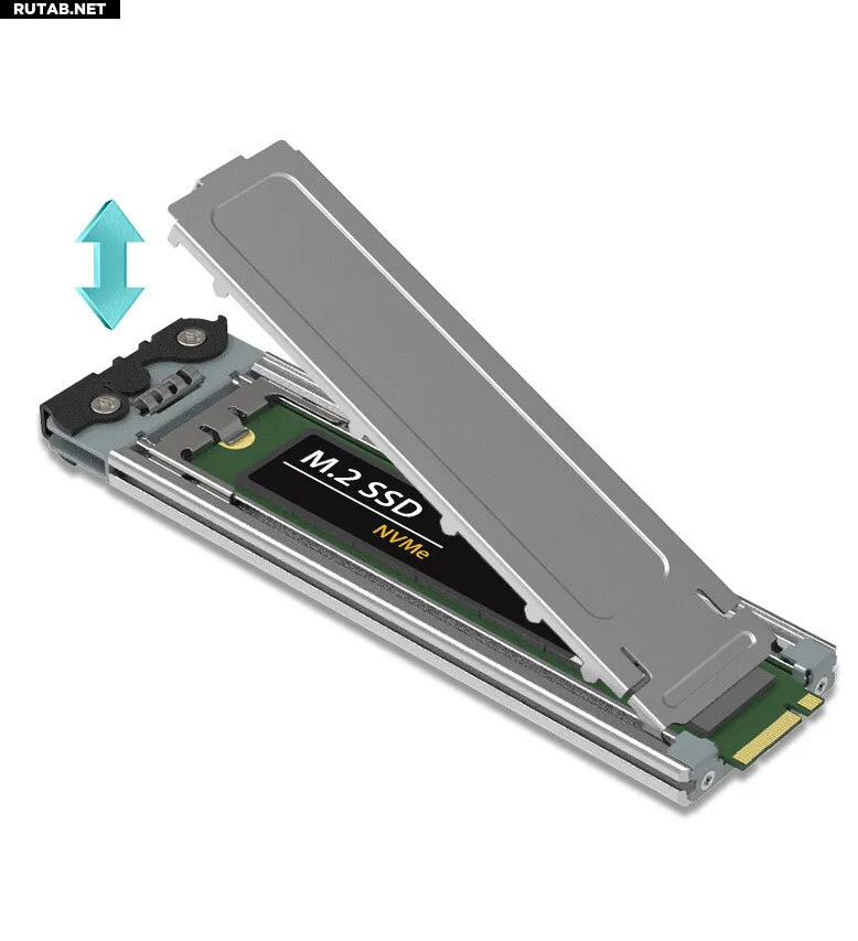 Алюминиевый лоток выполняет роль радиатора, эффективно отводя тепло от SSD. Для улучшения теплопередачи используется термопрокладка. Конструкция также включает защиту от электростатического разряда и антивибрационный механизм.