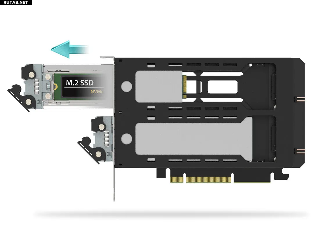 Конструкция с безинструментальными съёмными лотками позволяет установить или заменить M.2 NVMe SSD менее чем за пять секунд, избавляя от необходимости работать с мелкими винтами. Лотки поддерживают накопители стандартных размеров: 2230, 2242, 2260, 2280 и 22110.