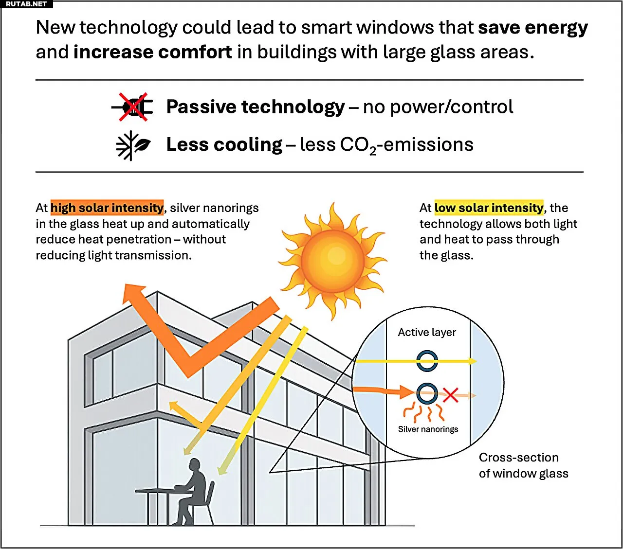 Микроскопические серебряные кольца всё эффективнее блокируют ближний инфракрасный свет по мере усиления солнечного излучения — без снижения прозрачности стекла.