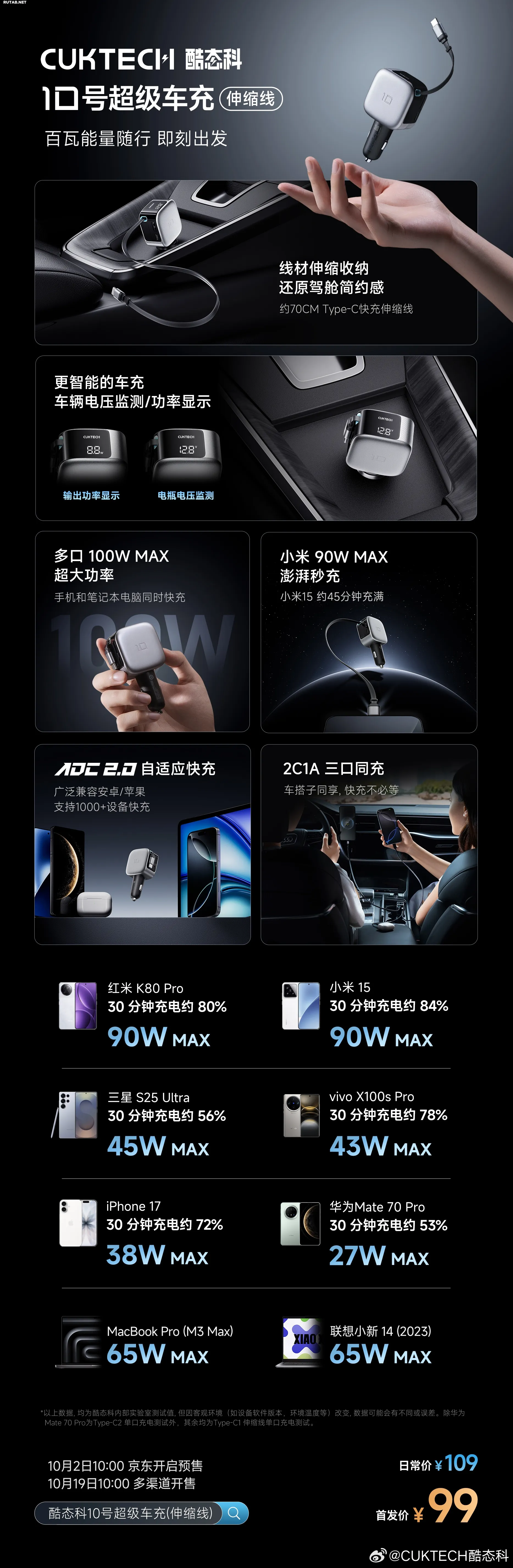 Официально стартовала предпродажа автомобильного зарядного устройства Cooltek No. 10 Super Car Charger с выдвижным кабелем. Новинка появилась в продаже на маркетплейсе JD.com по стартовой цене 99 юаней, тогда как обычная цена составит 109 юаней.