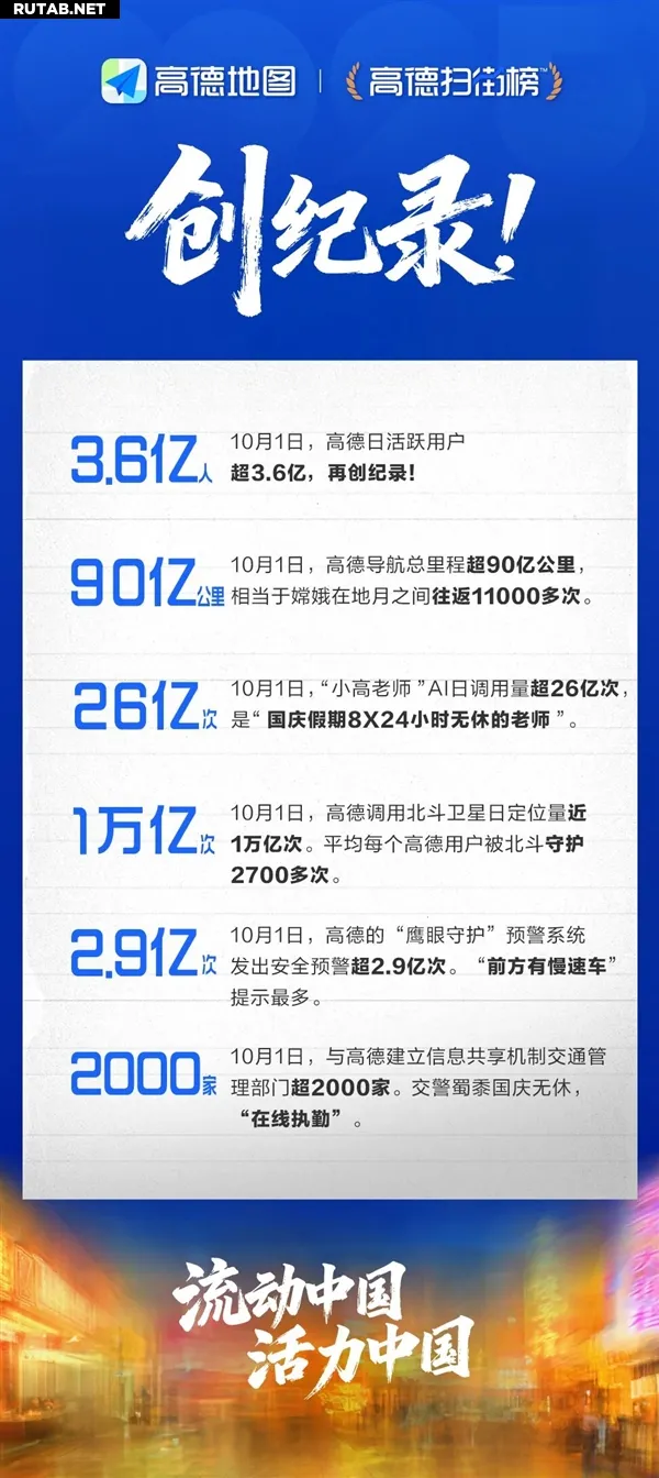 В первый день объединённых праздников — Дня образования КНР и Праздника середины осени — китайское картографическое приложение AutoNavi (高德地图) зафиксировало рекордную активность пользователей. Пиковое количество одновременно активных пользователей превысило 360 миллионов, что стало историческим максимумом для сервиса.