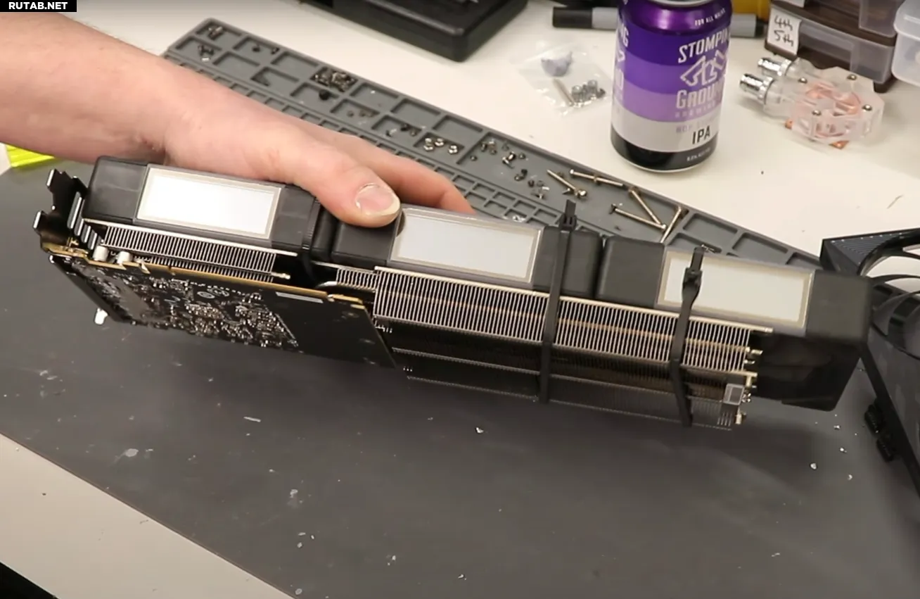 Первым шагом модернизации стала замена системы охлаждения. TrashBench заменил штатный небольшой кулер GPU на RTX 5050 на крупный радиатор, используемый в модели RTX 5060.