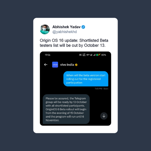 Представитель Vivo в ответ на запрос пользователя сообщил, что 13 октября будет создана группа в Telegram, куда добавят всех отобранных пользователей. Кроме того, он сообщил, что раздача бета-версии OriginOS 6 начнётся 15 октября и продлится до 6 ноября.