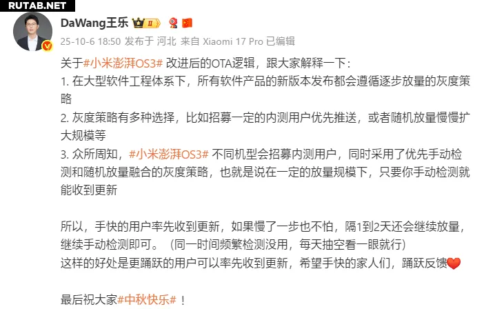 3. HyperOS 3 будет использовать стратегию, которая отдает приоритет ручной проверке обновлений и случайному распределению. Это означает, что при определенном масштабе выпуска пользователи, которые вручную проверят наличие обновлений, смогут получить их первыми