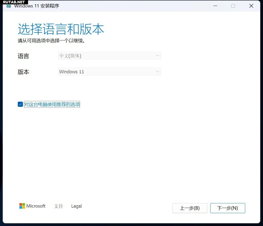 Выберите язык по умолчанию (русский) и систему (Windows 11), отметьте галочкой «Использовать рекомендуемые параметры для этого компьютера» и нажмите «Далее».