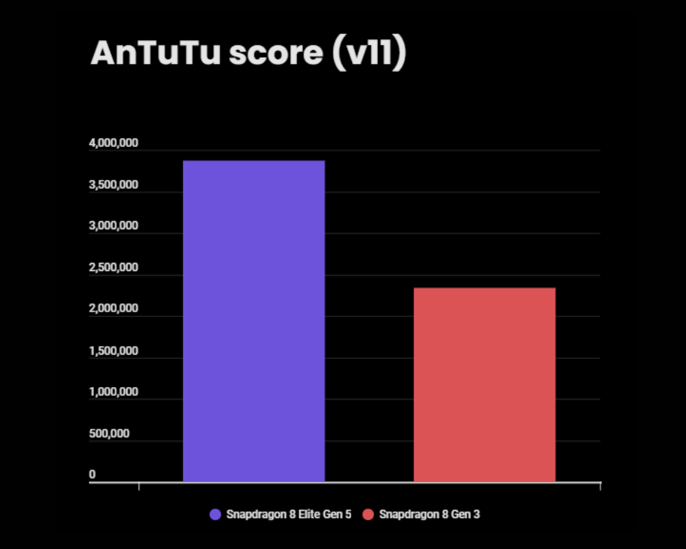 На платформе AnTuTu 11 Xiaomi 17 (на Snapdragon 8 Elite Gen 5) почти достигает отметки в 4 миллиона баллов. Некоторые топовые устройства, включая Honor Magic 8 и Vivo X300 Pro, набрали более 4 миллионов баллов в AnTuTu. Snapdragon 8 Gen 3, с другой стороны, набирает около 2,3 миллиона баллов. Это солидный прирост в 66% в общем счёте AnTuTu для 8 Elite Gen 5.