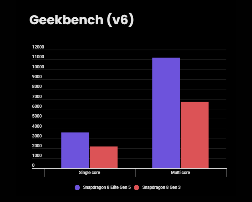 В Geekbench 6 Snapdragon 8 Elite Gen 5 набирает 3621 балл в одноядерном тесте и 11 190 баллов в многоядерном. В то же время Snapdragon 8 Gen 3 показывает лишь 2203 и 6714 баллов в одноядерном и многоядерном тестах соответственно. Это примерно на 66% выше у новейшего флагмана Snapdragon, что может иметь существенное значение, особенно в требовательных задачах.