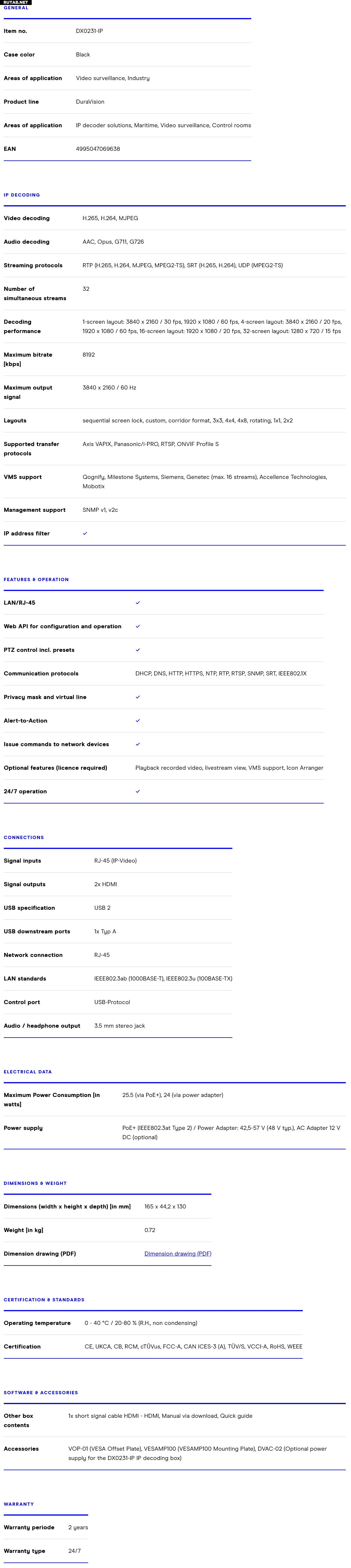 DX0231-IP представляет собой автономное решение для IP-декодирования, которое можно гибко настроить для подключения к двум 4K-мониторам для отображения видео с IP-камер или потокового видео. Устройство работает без ПК, прикладного программного обеспечения или дополнительного оборудования, что упрощает процесс установки и экономит время и деньги на первоначальную настройку и обслуживание системы. Это также снижает потенциальные источники ошибок и устраняет угрозы безопасности, поскольку для мониторинга конфиденциальных видеоданных по сети требуется минимальное количество оборудования.