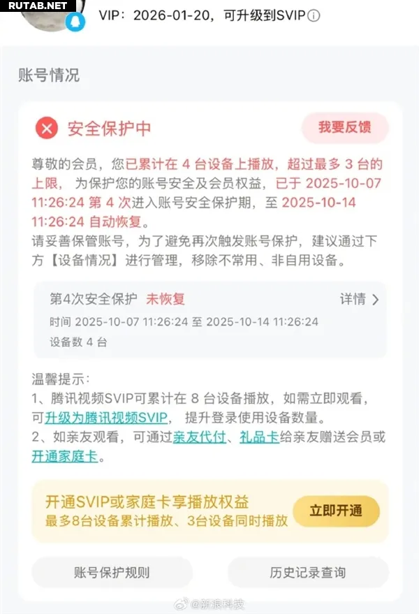 Пользователь китайского стримингового сервиса Tencent Video пожаловался в социальных сетях на блокировку своего VIP-аккаунта на 7 дней из-за превышения лимита подключенных устройств.