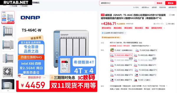 Если взять в качестве примера 4-секционный NAS-накопитель QNAP TS-464C-W, то версия без жесткого диска стоит 1599 юаней, а версия с четырьмя жесткими дисками по 4 ТБ — 4459 юаней. Это значит, что один жесткий диск емкостью 4 ТБ обойдется всего в 715 юаней.