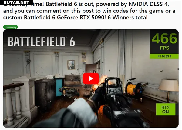 Вторая акция приурочена к релизу «Battlefield 6» и поддержке технологий DLSS 4, MFG и Reflex. NVIDIA разыграет кастомную видеокарту RTX 5090 в тематике «Battlefield 6» либо код для активации игры в Steam. Участие проходит на Reddit: нужно выбрать один из предложенных вопросов и оставить ответ в комментариях: