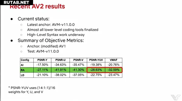 Совместный председатель AOM от Netflix, исследователь Эндрей Норкин подтвердил, что последние тесты показывают снижение битрейта AV2 по сравнению с AV1 на 28,63% в метрике PSRN-YUV(14:1:1) и на впечатляющие 32,59% в метрике VMAF при сохранении того же качества видео.