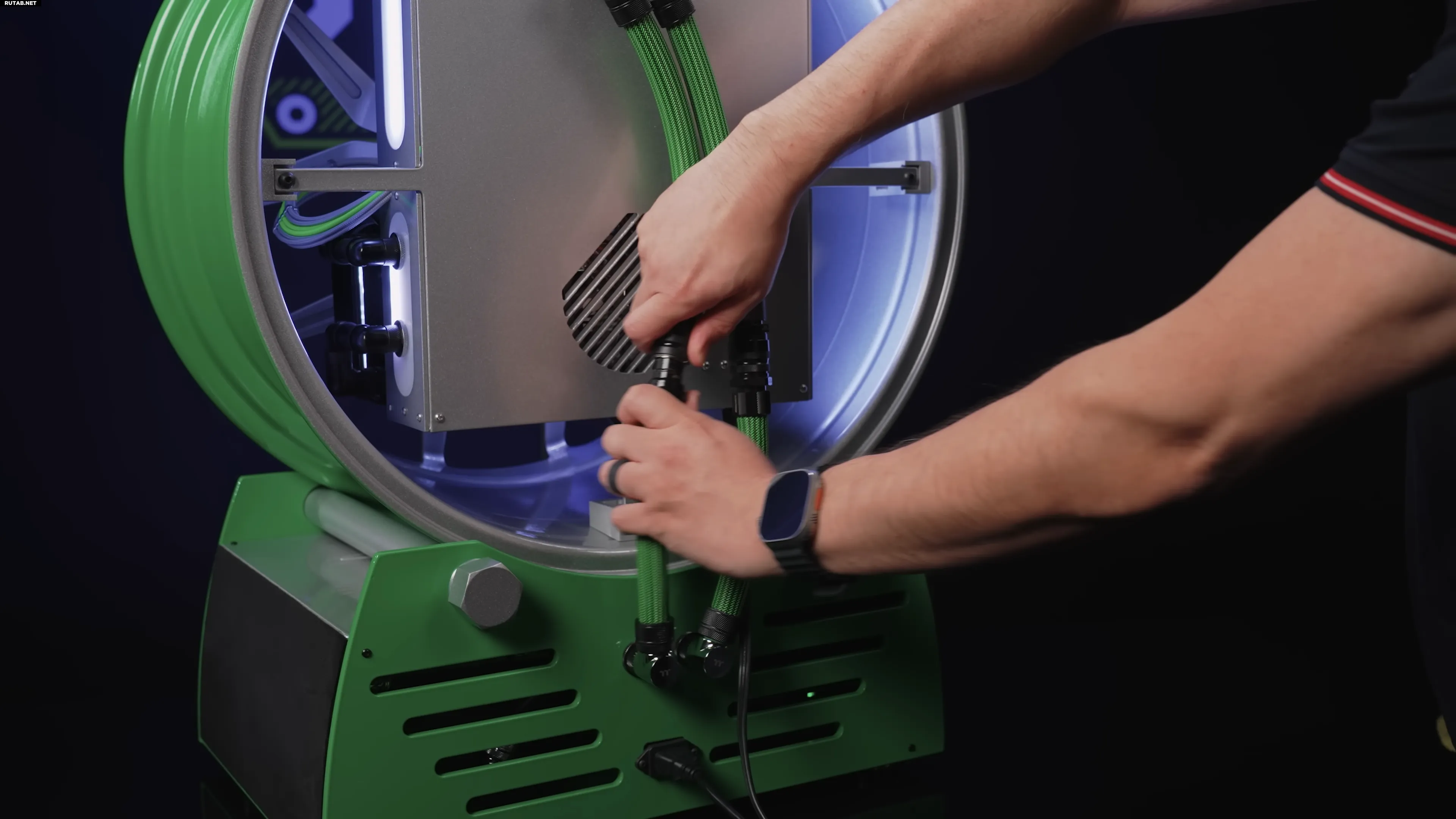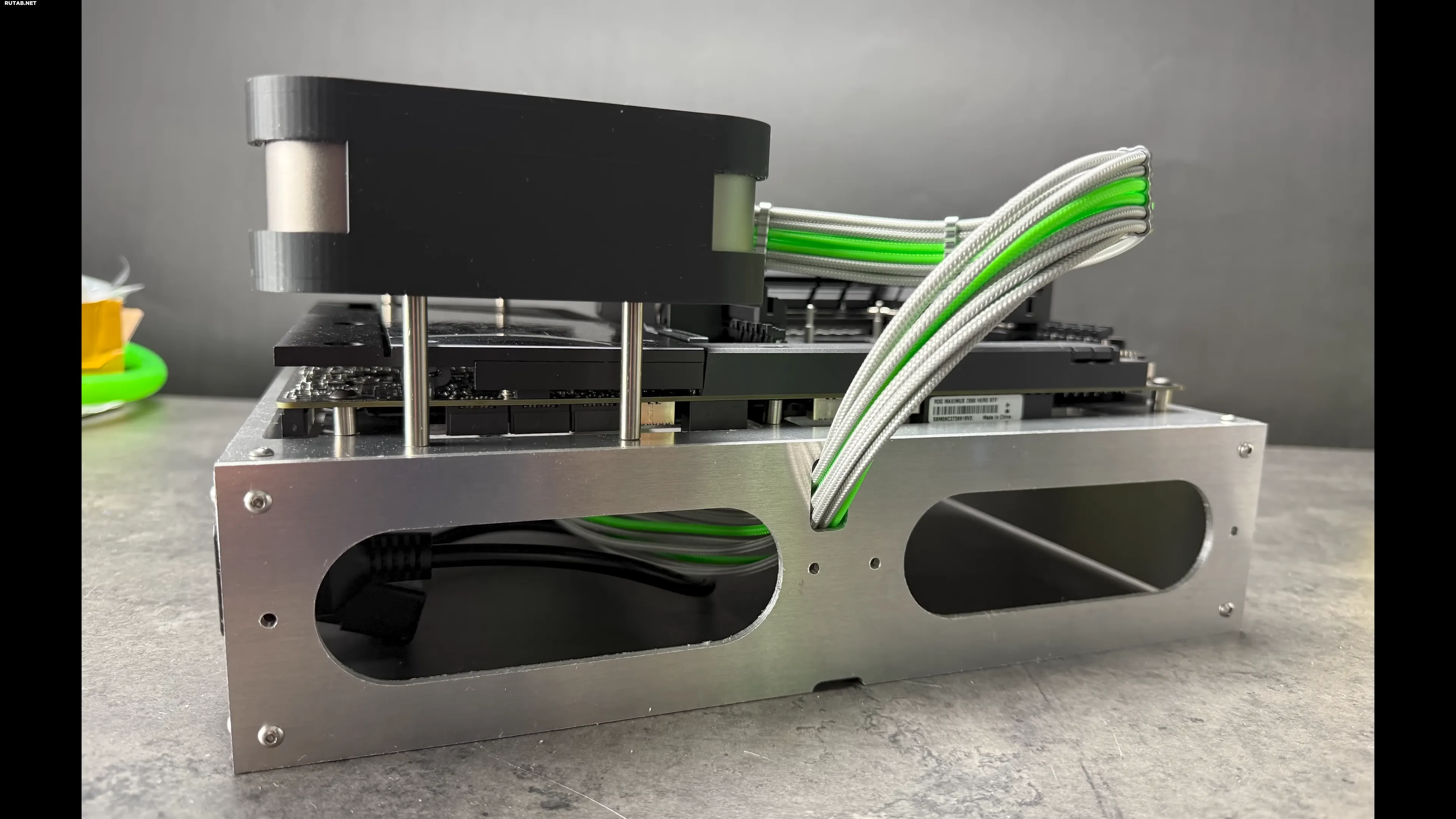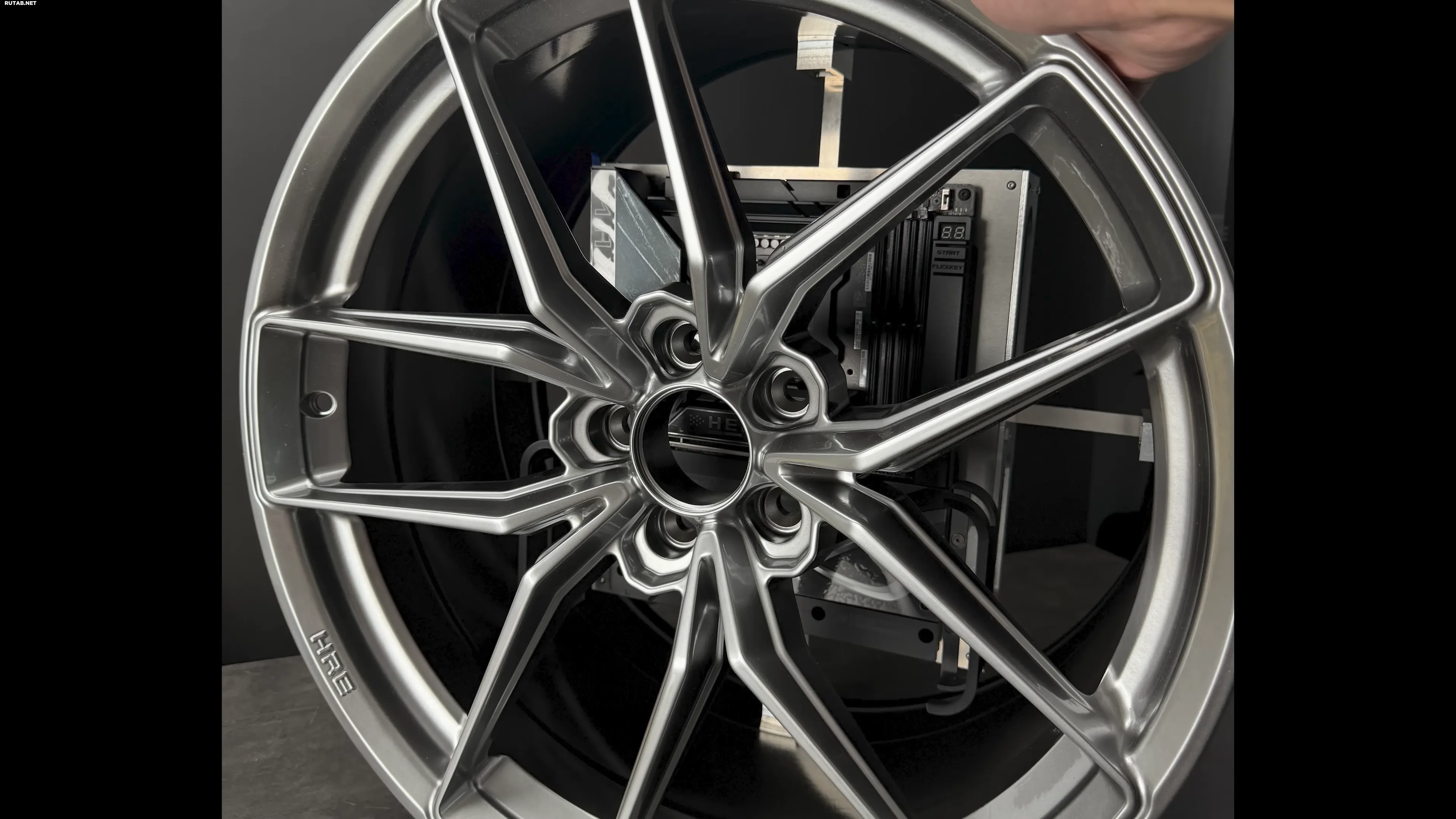 Основные компоненты ПК размещены за спицами колеса HRE FF21 стоимостью от 750 долларов (~60000 рублей). Материнская плата ROG Maximus Z890 Hero с процессором Intel Core Ultra 9 285K установлена на специальной платформе, создающей эффект парения. Вся проводка скрыта в толстой (около 7,5 см) панели.