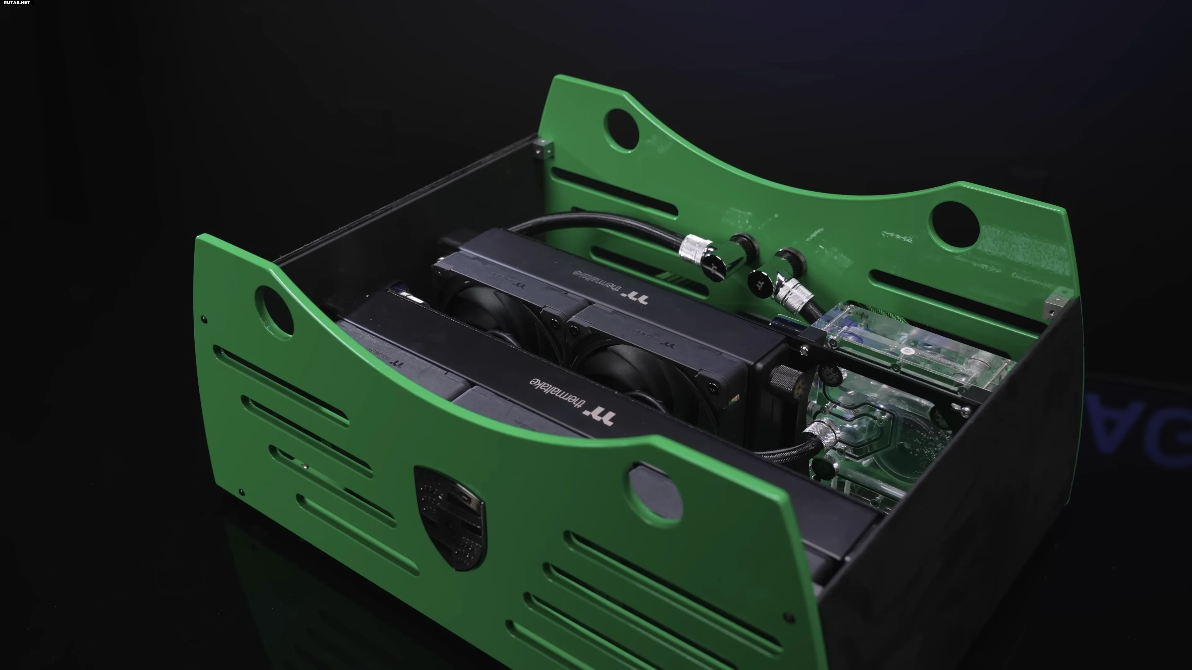 Система жидкостного охлаждения вынесена в отдельный отсек под колесом, где размещены помпа, резервуар и радиатор. Для подключения используются быстросъёмные соединения. На процессорном водоблоке установлена миниатюрная модель Porsche 911, а на видеокарте RTX 5080 — копия награды NAACP, которую получил будущий владелец системы.