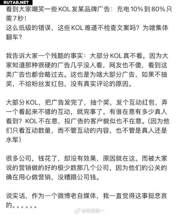 Блогер @科技新一 (Новые технологии) высказался по этому поводу в Weibo, раскрыв глубинные проблемы в сфере маркетинга через KOL. Его заявления быстро привлекли внимание.