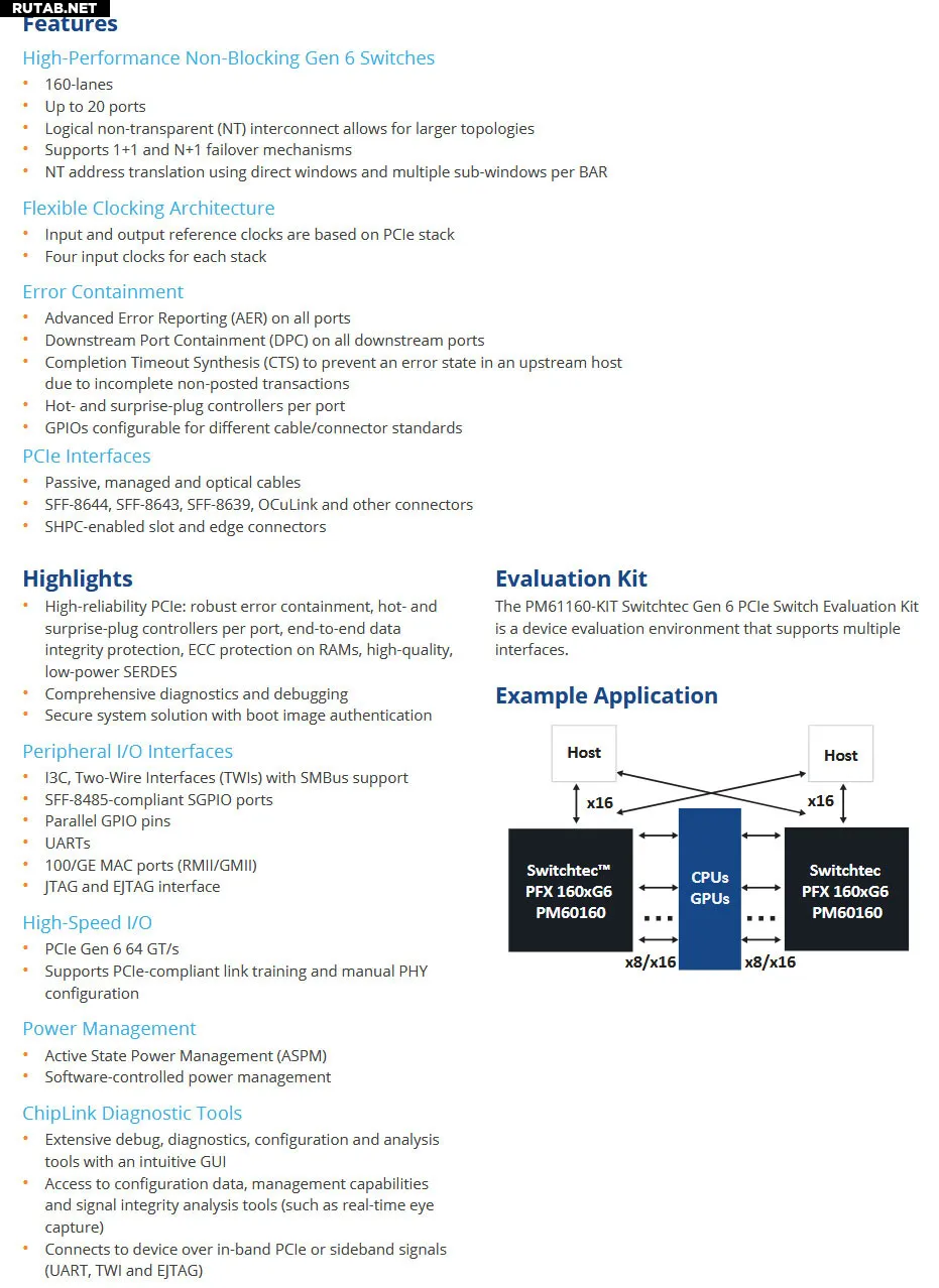 Семейство Switchtec Gen 6 PCIe включает коммутаторы с 20 портами и 10 стеками, каждый порт оснащен контроллерами «горячей» замены. Также поддерживается технология NTB для подключения и изоляции нескольких доменов хостов и multicast для распределения данных по схеме «один ко многим» в пределах одного домена.