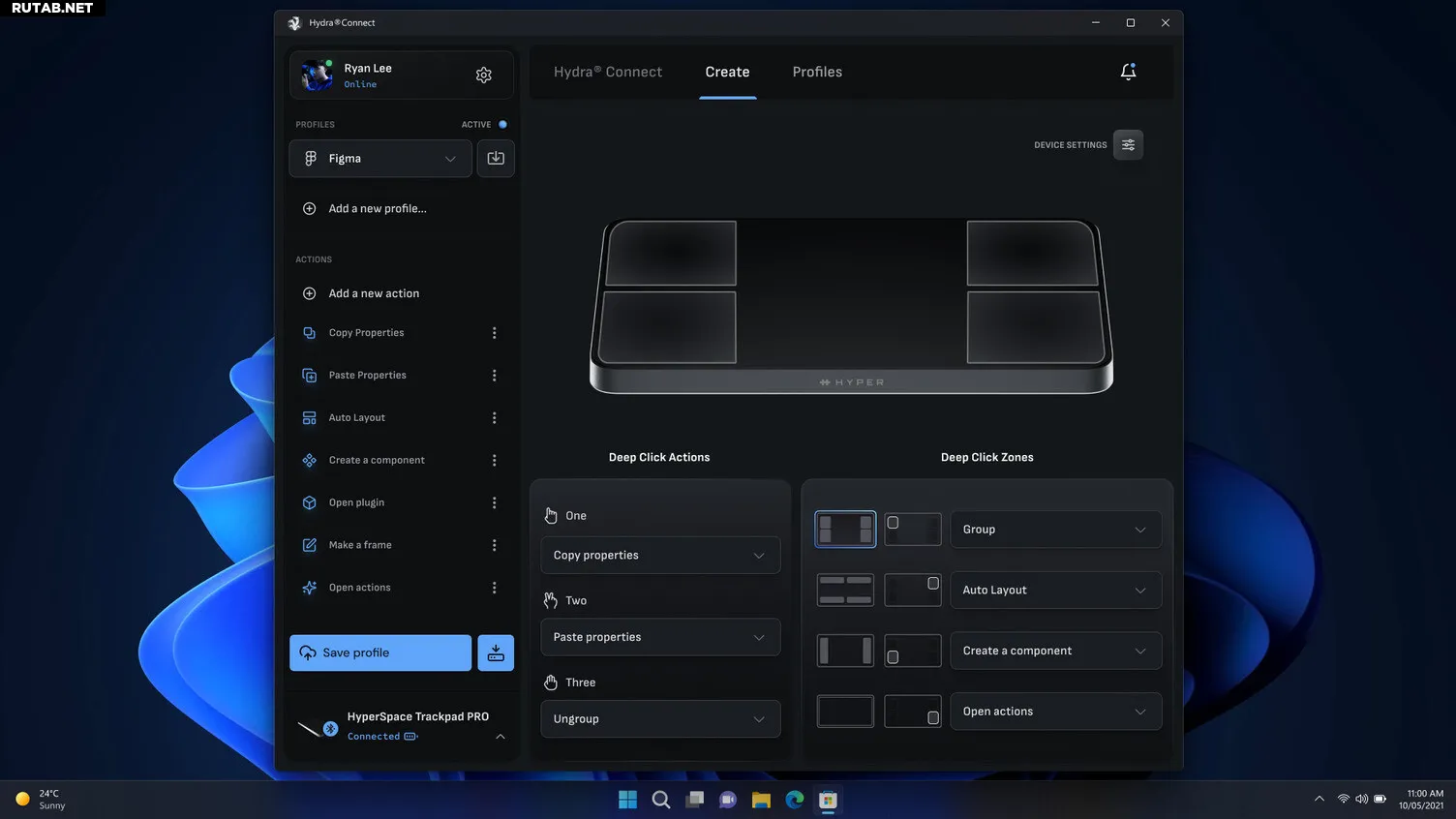 Программное обеспечение Hydra Connect для Microsoft Windows отличает Trackpad Pro от других трекпадов, позволяя пользователям создавать зоны глубокого нажатия, угловые ярлыки и профили для конкретных приложений, которые автоматически переключаются в зависимости от активной программы.