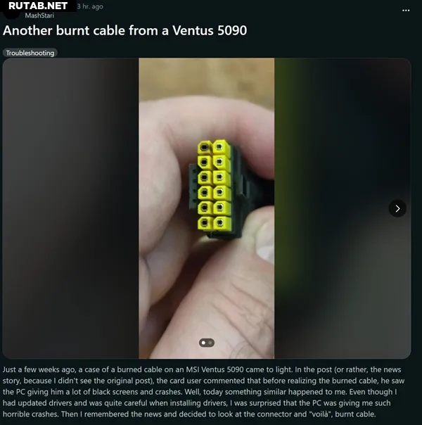 Четвертый случай: еще одна MSI RTX 5090. Пользователь в течение полугода аккуратно эксплуатировал карту, регулярно проверяя разъем питания и кабели, и использовал блок питания MSI AI1300P. Несмотря на все предосторожности, карту постигла та же участь.